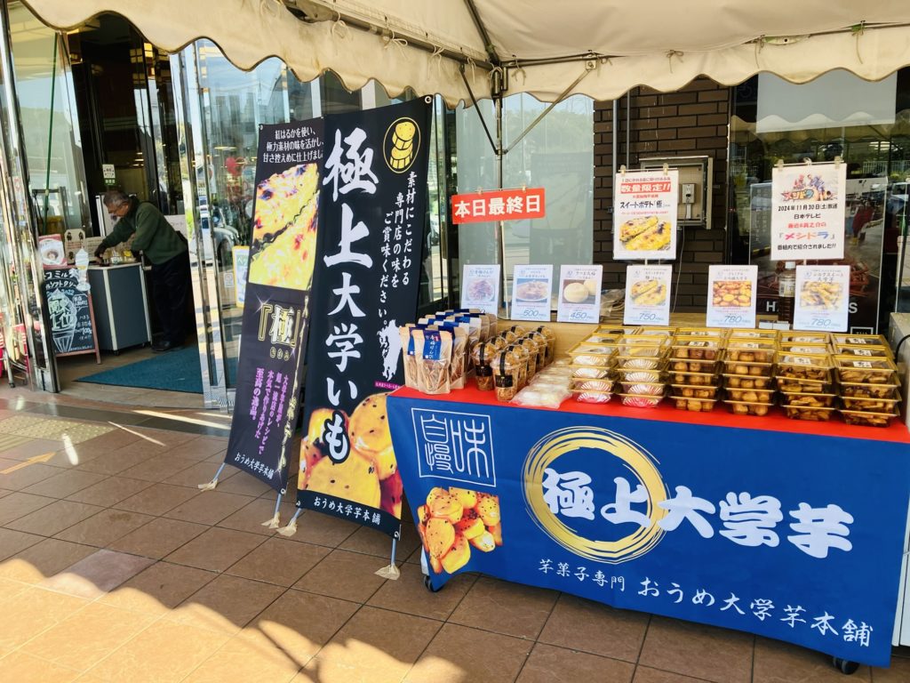 今日のラインナップは、プレミアム大吟醸大学芋、シルクスイート大学芋、パリパリ大学芋チップス、スイートポテト極、青梅けんぴ、さつま大福です🍠