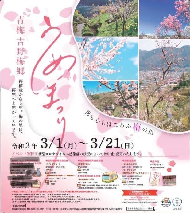 今年もコロナ禍で緊急事態宣言発令中ですが、我が青梅市では『青梅吉野梅郷うめまつり』(3/1〜21)開催中です‼️