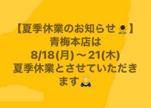 青梅本店は8/17(月)〜21(木)の四日間、夏季休業とさせていただきます🙇♂️