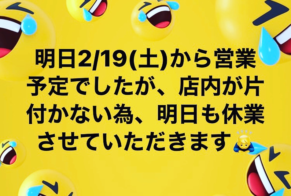 明日2/19からオープン予定でおりましたが、まだ店内が片付かない為、明日も休業させていただきます🙇♂️
