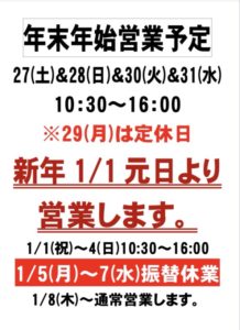 年内は29日(月)のみ定休日、その前後27日(土)〜31日(水)は10時30分〜16時まで営業いたします💡