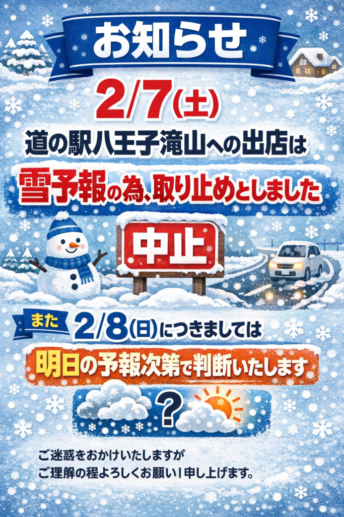 2/7(土)道の駅八王子滝山への出店取り止め♪ 【悲報第二弾】明日2/7(土)に予定してました道の駅八王子滝山への出店は、雪予報のため取り止めとしました❄️ また2/8(日)の出店につきましては、明日の予報と状況を確認の上判断したいと思います #おうめ大学芋本舗#青梅大学いも学部 #カインズホーム お勧めの記事2021年2月7日 2/7(日)エキュート立川出店最終日♪ 2/7(日)エキュート立川出店最終日‼️ 長かった1週間でしたが、最終日になるとあっという間に過ぎた感じですね💨最後の力を振り絞って頑張 […]2025年11月14日 11/15(土)〜キャッシュレス最大30%還元キャンペーン♪ 明日11/15(土)〜12/26(金)の期間、青梅市内対象店舗にてキャッシュレスで最大で30%戻ってくるキャンペーンが始まります‼️なんと当店はauペイ、d払い、楽天ペイ、Pa […]2025年8月15日 8/17(日)カインズdeおうめマルシェに出店します♪ 8/17(日)カインズdeおうめマルシェに出店します‼️今回はカインズホーム青梅インター店2階駐車場での開催となります今回のラインナップは、プレミアム大吟醸大学芋、スティック […]2025年10月3日 新商品『スイートポテトあんパイ』登場♪ 新商品『スイートポテトあんパイ』✨スイートポテト極とつぶあんの奇跡のコラボこちらイベント用商品となり、本店では買えないうえに、気の向いたイベントしか提供しない激レア商品です […]2025年12月30日 本日12/30(火)2025催事最終日♪ 12/30(火)道の駅八王子滝山店頭催事&カインズホーム青梅出店最終日‼️2025年の催事は本日千穐楽となります一年間、各地におきまして大変お世話になり、ありがとうご […]2025年9月29日 2025.10月催事出店スケジュール♪ いつもご愛顧をいただき誠にありがとうございます✨昨日9月のイベント催事が無事に終わりましたまだ残暑厳しかったですが、新芋効果で乗り切れました暑さ寒さも彼岸までと言いますが、 […] 関連 By 学部長 | 2026年2月6日 | Blog | ← 2/7(土)カインズ青梅への出店取り止め♪
