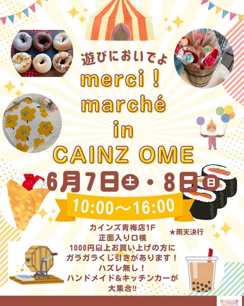 6/7(土)&8(日)の二日間、カインズホーム青梅インター店で開催されます『MERCI MARCHE IN CAINZ OME』(10時〜16時)に出店します‼️
