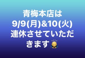 青梅本店は9/9(月)&10(火)連休させていただき、来週後半からのイベント催事に向けて、しばし英気を養いたいと思います♂️